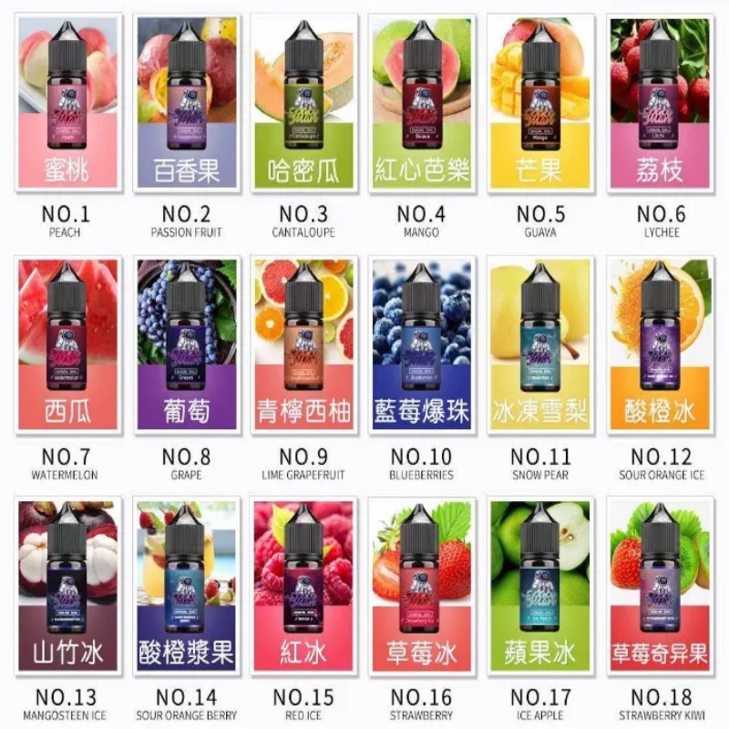 超過30款人氣口味,包含水果系列(蜜桃、百香果、葡萄)、飲品系列(紅牛、莫吉托)、茶香系列(烏龍茶、茉莉花茶)、經典風味(雪茄煙草、老冰棍)等,全面滿足不同口味需求。 -